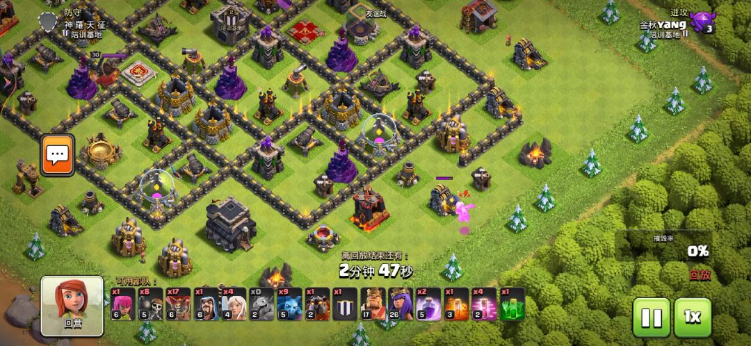 气球:高伤害,低血量,低移速的空中单位,下出气球后,会攻击离自已最近的防御建筑。 天使:治疗地面部队,或者说“女皇的好帮手”可以持续续航,不要让天使跟空中单位走(不然她会让你知道什么叫冷眼旁观),由于九本防御火力不是很强,天使带4个足够。