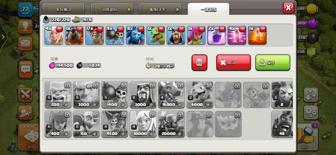 下面我们上配兵及援兵搭配,援兵选择:天狗十极速法术或骷髅法术,骷髅法术目的比如对手女皇不好处理,可以拉住女皇不让打狗球主力(如有不适,自行更改)。