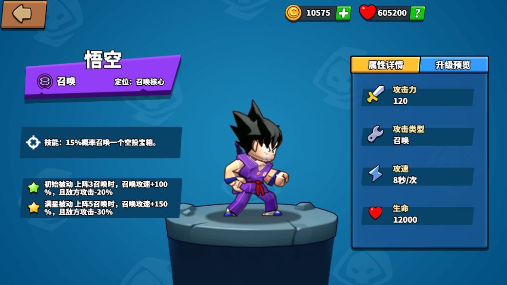 召唤核心当然是我们的悟空啦!悟空的技能是:15%概率召唤一个空投宝箱。