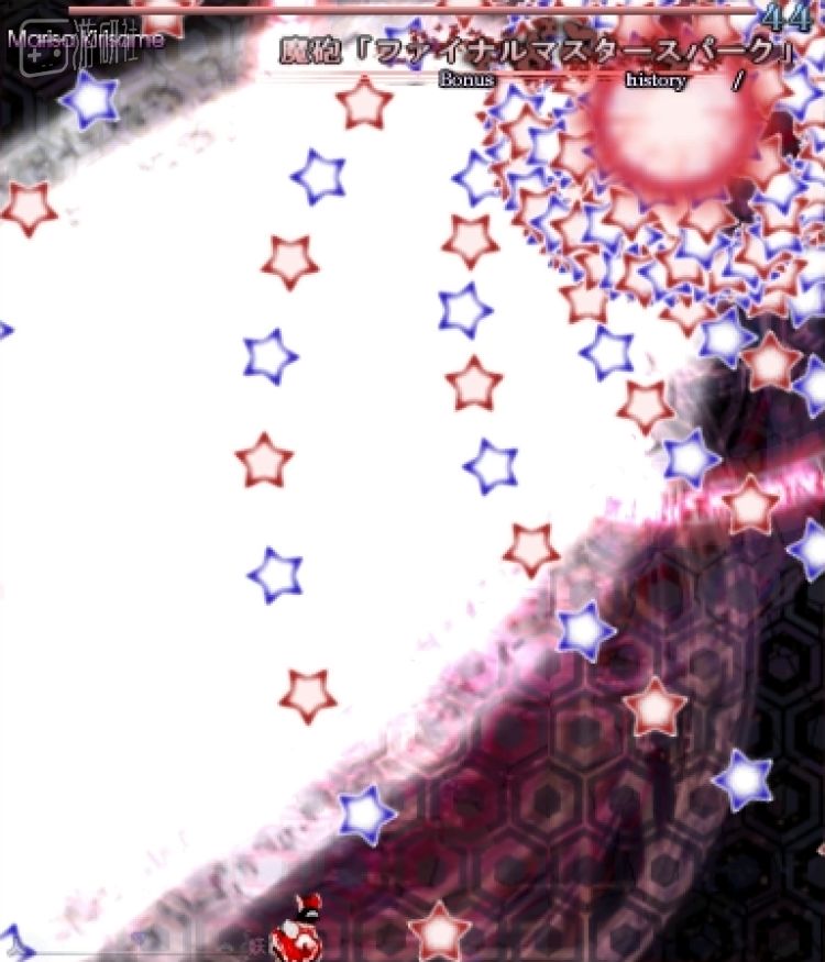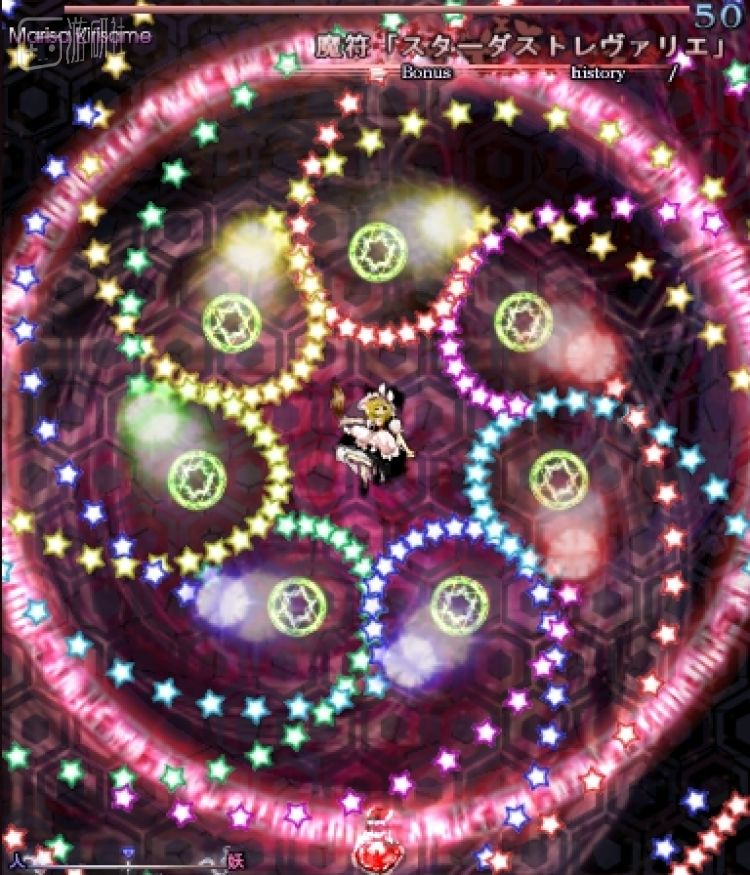 在艺术作品中,体现一样事物的华丽高贵,喜欢用闪闪发光的效果来表现。而在永夜中闪耀的星星弹幕,便是魔理沙所追求的华丽的魔法。