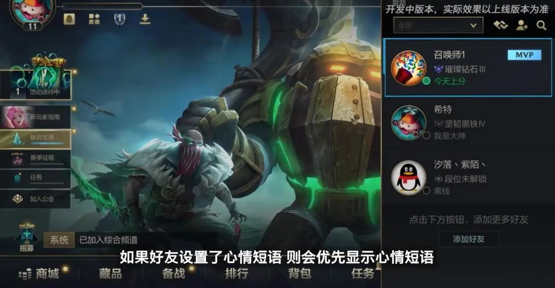 如果好友已经开始对局,召唤师们也将更清晰地掌握他们创造高光时刻的“秘诀”——他们在对局中使用的英雄将显示在好友名片的召唤师状态中。