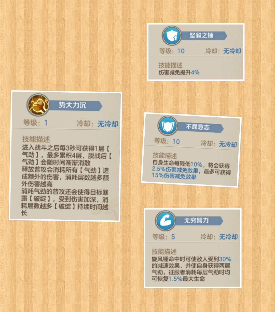 势大力沉:这点和终结者一样,战斗叠加最多四层气劲,释放普攻消耗气劲,造成额外伤害和破绽的伤害加深效果,是强化普攻的专属被动技能,让战锤的普攻输出伤害大幅提升并给目标造成一定时间的持续伤害加深的buff.