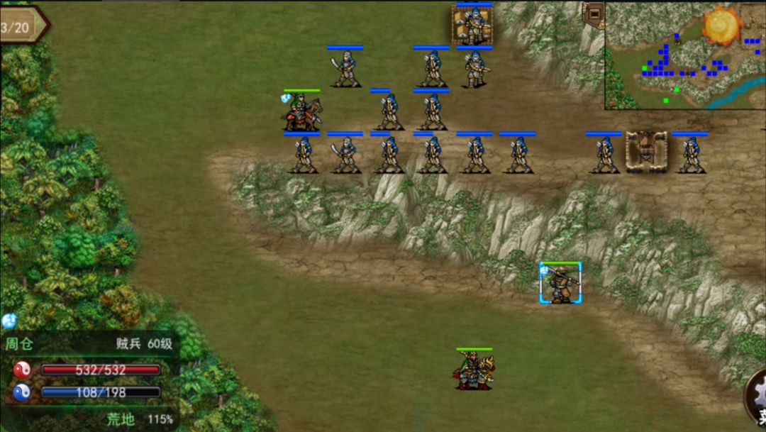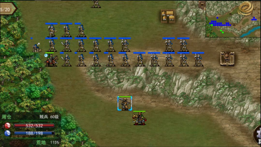 第18-20回合,共3次行动机会,此时敌军数量,最多最多也就3-5个。如果数量少,周仓可以走位点杀,如果数量较多,可以走位引敌军一起然后放技能。