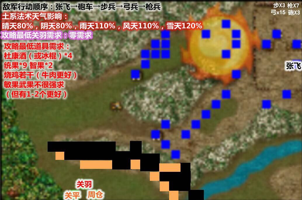 第15合必须到荒地(16,16),斜刺打死残血砲车。此时关平会挨2砲。死不了就是了。