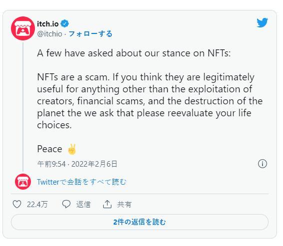 PC 独立游戏平台 itch.io 在推特上公开表明立场,强烈谴责了 NFT 和参与 NFT 的各方人士。itch.io 认为「NFT 就是场骗局。如果你觉得 NFT 除了剥削创作者、金融诈骗、环境破坏这些负面目的以外还能起到什么积极作用,那还是请你重新斟酌一下自己的人生选择吧」。