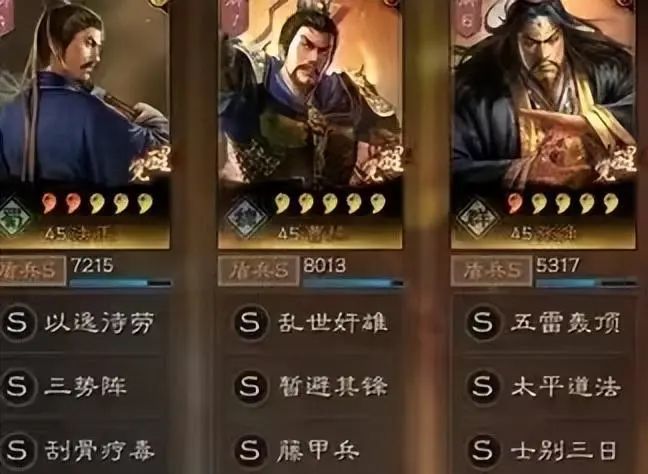 可以看出来,这队三势张角盾在普通藤甲张角盾的基础上,我把程普换成了曹操。法正依旧是纯辅助。张角依旧是单核输出,不过携带的是藤甲兵比较怕火,如果是满红高红可以换成陷阵营,白板就老老实实玩藤甲。三势阵增加法正自带战法的发动率,让原本非常演戏的法正不再演戏,并且张角吃到三势阵的增伤效果配合曹操的伤害加成,张角的爆发输出实在是太猛了。