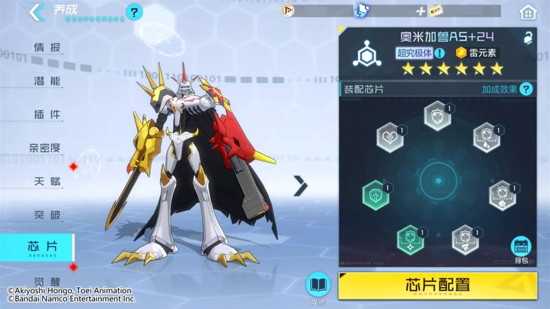 除了【数据回路】系统以外,各位队长达到35级后即可解锁【芯片】系统。届时究极体及超究极体数码宝贝,将在养成玩法中新增芯片功能。当数码宝贝达到指定星级时,即可开启相应数量的装配位置,以此来镶嵌更多的芯片配件,快速提升数码宝贝的各项属性。