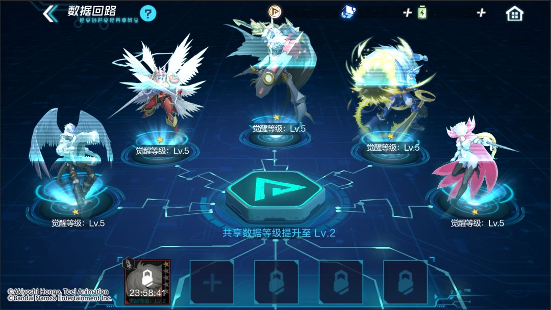 在新世纪进行内容更新后,游戏内将上线【数据回路】系统,当队长们达到60级并解锁觉醒功能后,即可通过数据回路中的特殊功能,共享数码宝贝的觉醒等级,轻松体验更加丰富的编队阵容组合。