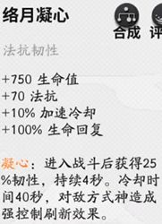 作为一件cd法抗装,络月凝心值得被缺cd但不需要输出的坦克所选择,用袖爪镜子凝心凑足40cd;对于麻仓叶炭治郎酒吞和尚这样带硬控多技能的战士,凝心相比三途在面对控多的阵容时也有一定优势;但是韧性这个属性毕竟难以量化,甚至不同人的习惯也不一样,还是需要实战检验