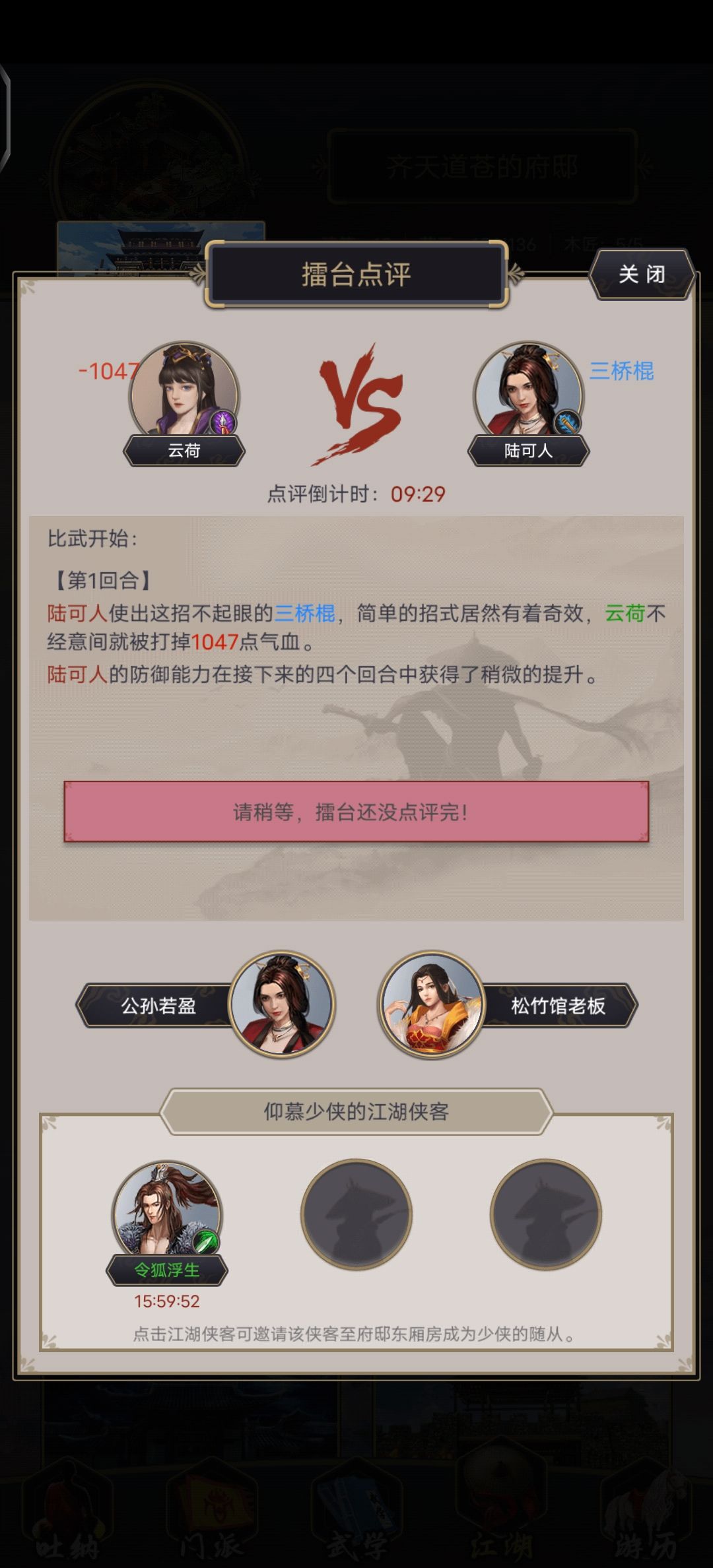 猜侠3轮全中会提示你是要人还是继续猜点击要人的话这个猜侠就停了就只可以带回目前在等待的侠客了点击继续猜侠就可以进行下一轮这时候你点击侠客应该是会显示请稍等,擂台还没点评完这个情况你只需要点击旁边空白的地方退出猜侠界面看准了侠客停留的位置进入猜侠界面立马点击就回跳转到厢房的界面然后安置侠客就可以返回擂台还可以继续猜侠了