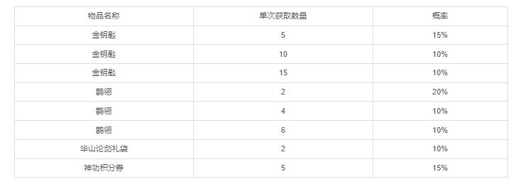 2、可抽取:金钥匙、鹊翎、华山论剑礼袋等超值大奖,100%中奖率!