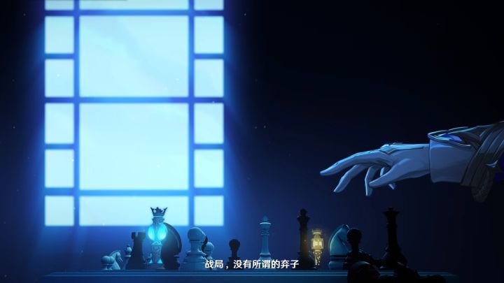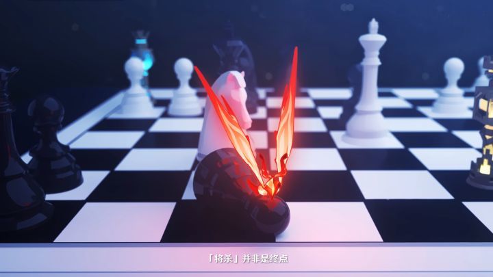 愚人众“丑角”面前的国际象棋棋盘,摆放着他们从风神与岩神手中获得的两枚神之心。温迪的蓝色风神之心像棋子“后”,钟离的岩神之心则像棋子“车”,又根据画面中代表女士的蝴蝶落在被“马”击倒的“兵”上,可以猜想击败女士的雷神大概就对应着“马”。
