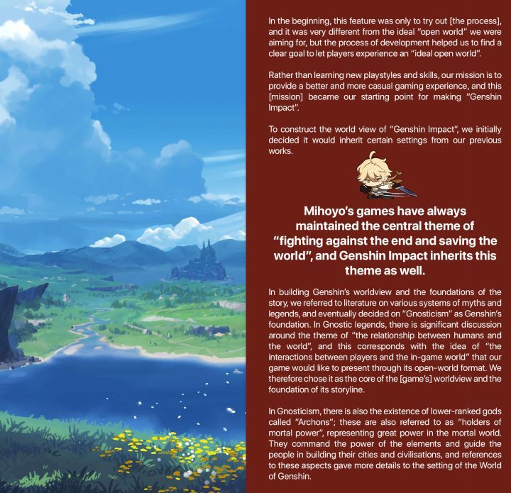 神之心、天理、异乡人、尘世七执政(Archons)、提瓦特(Teyvat,希伯来语拉丁转写的“方舟”)、虚假的星空……太多太多世界观设定直接取自古典诺斯替神话的各个部分 ,甚至包括整个主线剧情的大纲和主旨——但是有一个重要区别,古典诺斯替是消极厌世的,而原神的主题显然没这么悲观,毕竟技术宅还是要拯救世界的,所以原神虽然披着古典诺斯替的皮,讲的却是现代灵知主义对人类存在意义的积极回应 ——天理残暴,秩序冷酷,民不聊生,咋办?举起反旗,推翻旧世界,拯救自己,创造属于人类的崭新未来!