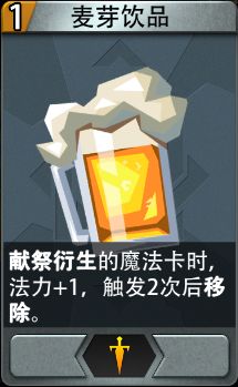 麦芽饮品:特殊装备卡,献祭衍生的魔法卡时,法力+1,触发2次后移除。