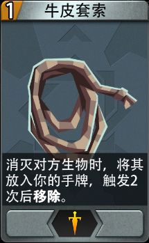 牛皮套索:特殊装备卡,消灭对方生物时,将其放入你的手牌,触发2次后移除。