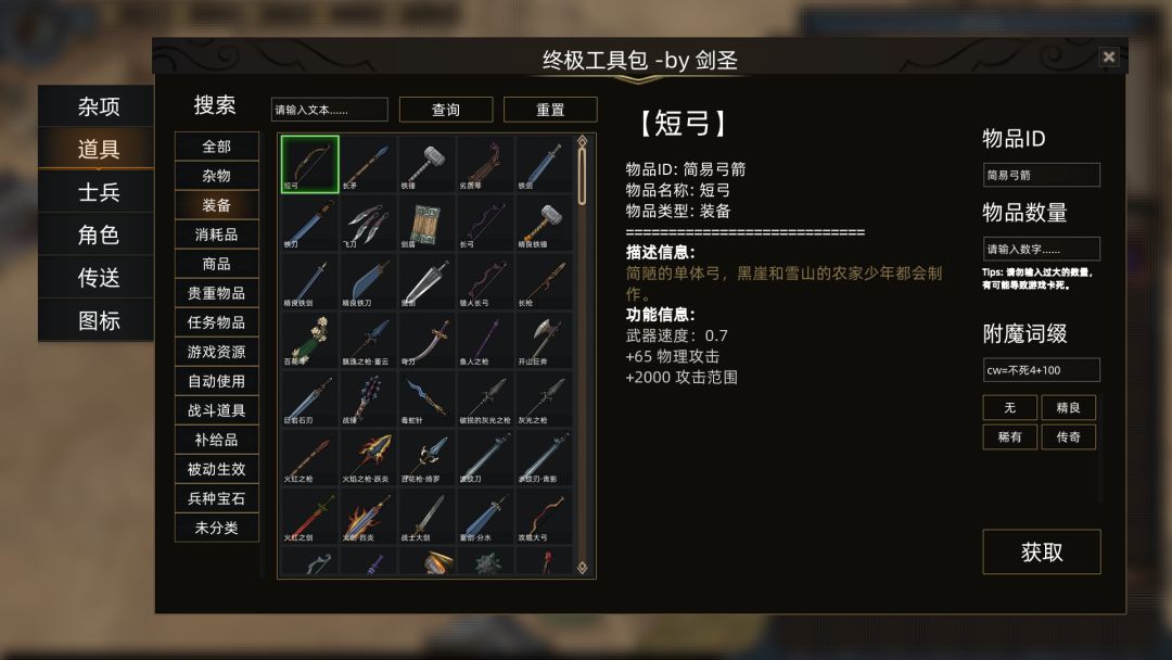 cw:创建制定词缀:cw=词缀ID+变量数值附加基数(0-100)例:长剑,1,cw=吸血剑+50说明:表示附带吸血剑指定词缀的物品,所有变量数值指定由50-100之间。