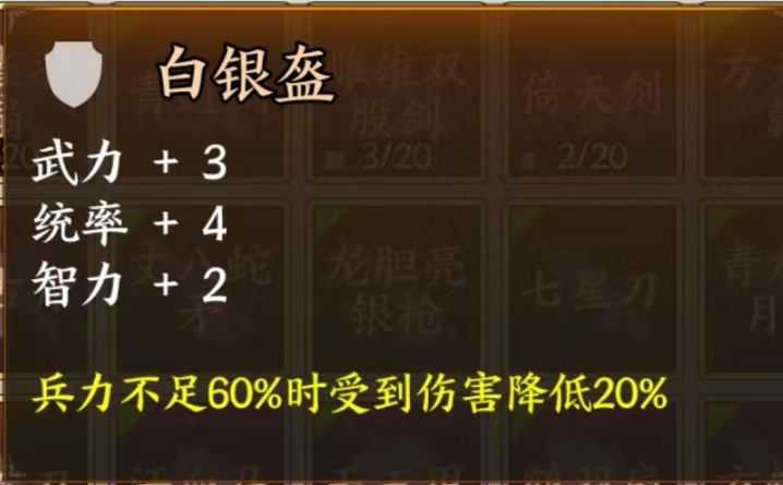 白银盔加3点武力、4点统率、2点智力,作为防具,不加政治都好说。