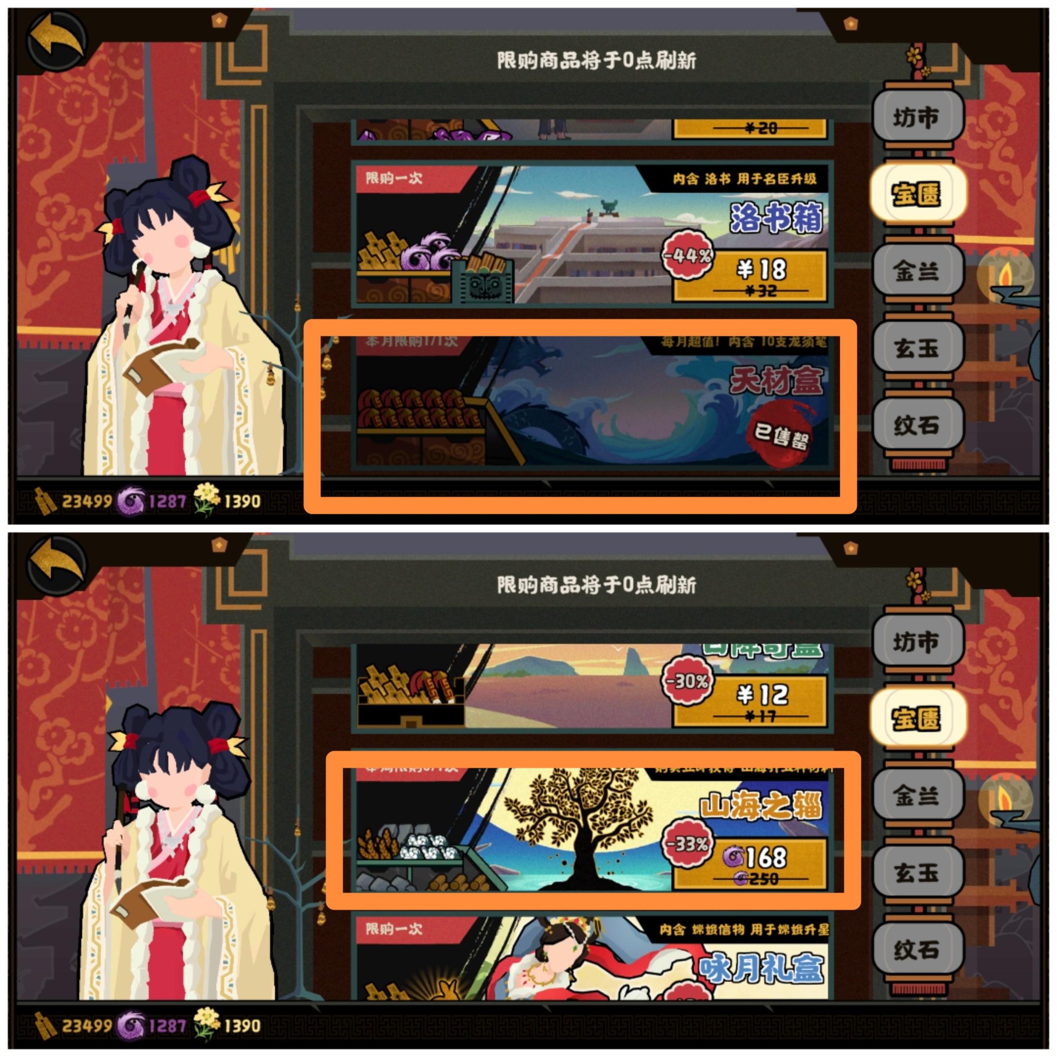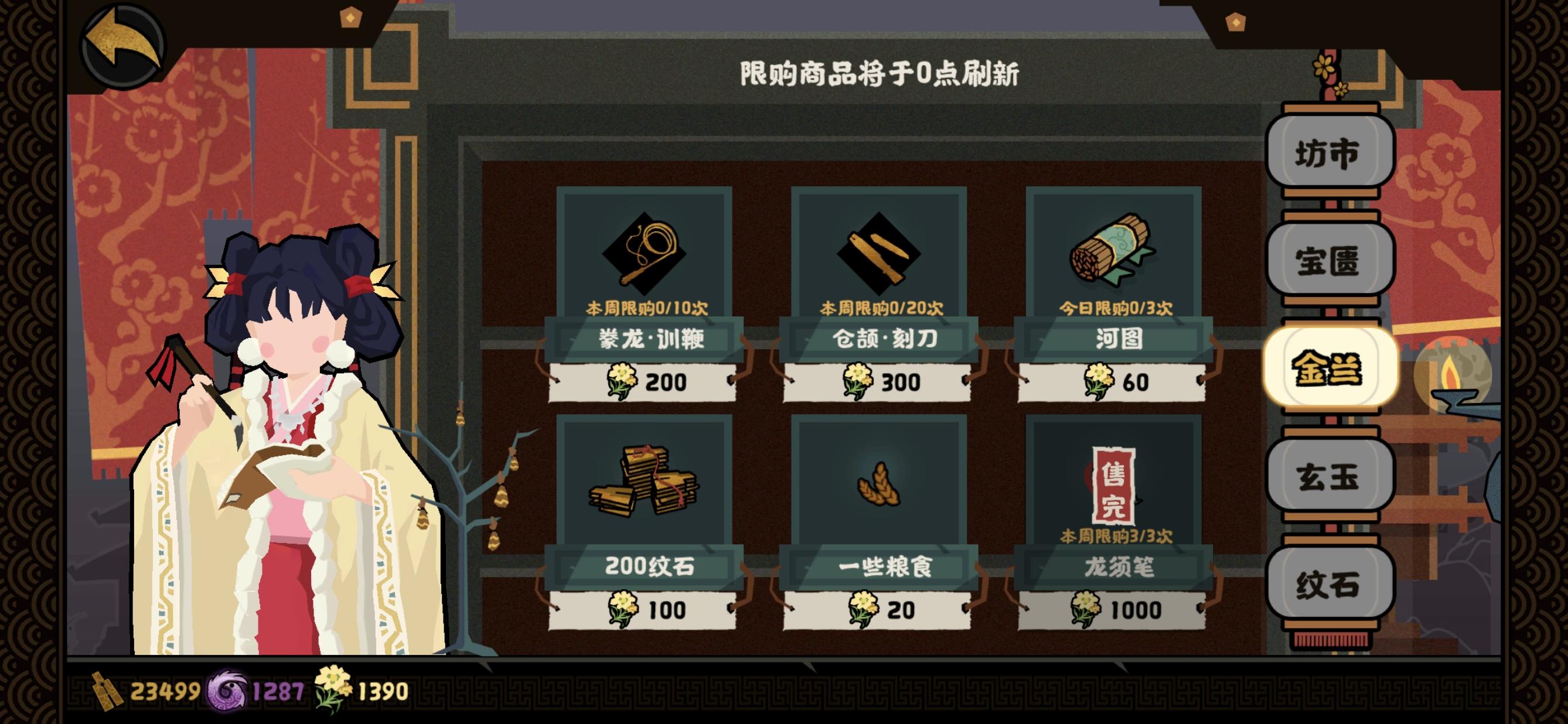 金兰商店我每周都会花3000金兰换3支笔,其次就买粮食和纹石,最后才是河图和名臣信物。
