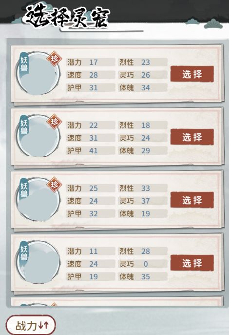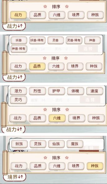 点击选择灵宠左下角,可以从战力、品质、六维、境界、种族五个方面选择出自己想要提升的主灵宠。