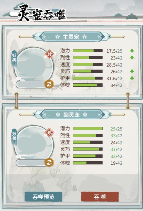选择好副灵宠后,点击吞噬预览也可以查看吞噬后可能获得的属性提升。