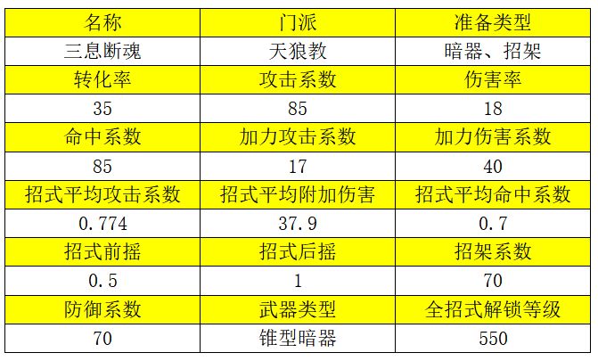 2、由于暗器没有神兵,三息断魂本身的系数也很低,导致这套武学平砍伤害非常低。落月的月华剑法也是类似的设定,平砍低,主要依赖技能输出。但月华剑法自身的平砍还是比三息断魂高得多,加上技能收益之后伤害足以达到九龙鞭法的水平。三息断魂虽然腐毒伤害很高,但由于平砍太低,加上技能也只能达到慈航渡世剑的水平,跟九龙鞭法还有25%左右的差距。