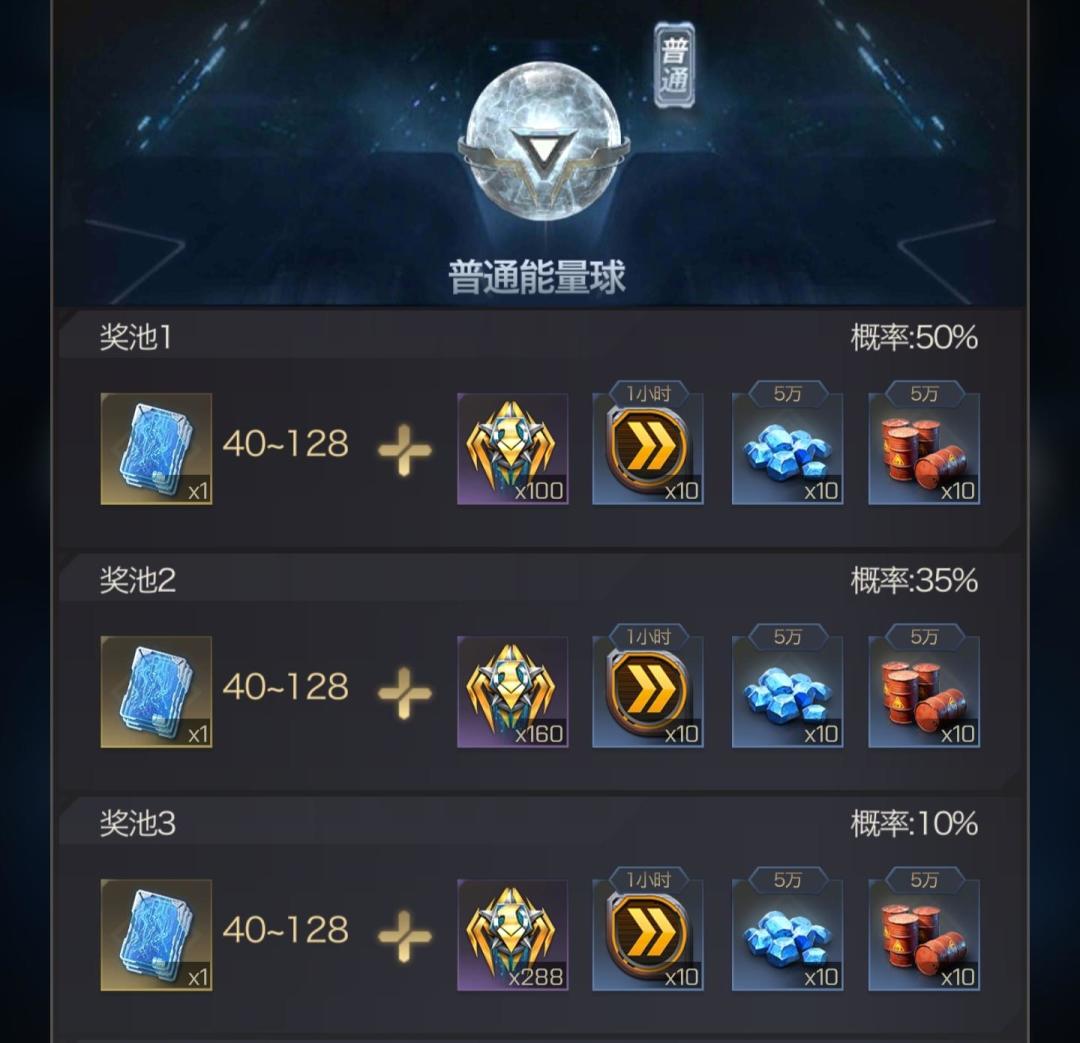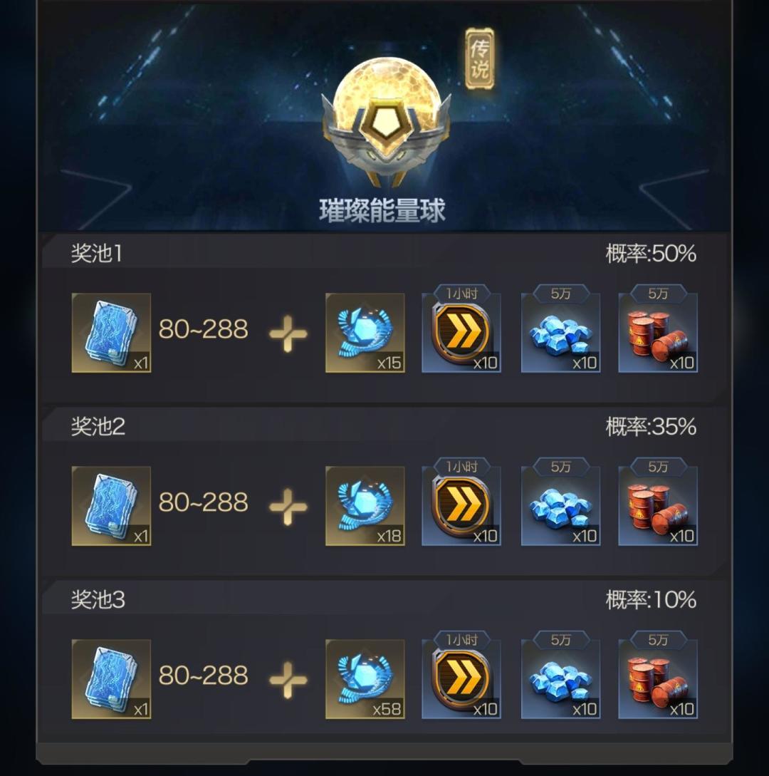 二、能量球分为普通能量球,稀有能量球,璀璨能量球,每种能量球里都有四种奖池,对应不同的奖励,开启能量球可获得四种奖池奖励之一(不同奖池奖励获 取概率不同,游戏内已公示概率),能量球等级越高开启能量球获得的奖励越丰厚哦。