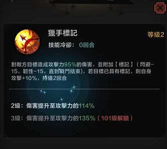 这个技能我认为是游戏里最强普攻,首先135%基础系数对于单体一段输出的普攻,是不低的(标准140),重点在于标记效果。标记一方面配合被动是灼烧的关键,第二点是这个被动本身带来-15闪避和-15韧性。闪避都好理解,增加命中几率。15韧性是减少15%暴击概率和暴击伤害,在游戏后期多15%暴击伤害会都很多伤害,并且这个标记是永久(可以被净化清除)。