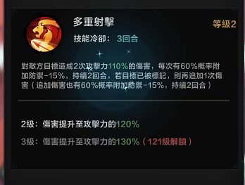 核心输出技能,正常2段,暴击3段,总体有135*3=405%,在同类技能里排名前列。作为2技能没有时间叠buff,伤害不够或冷却时使用。前期英雄属性底时,暴击率很低,所以优先使用2技能伤害更高。