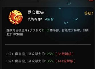 核心输出技能,首先在有标记的目标身上额外触发一次,实际上是130*3,总伤达到了390%,在3冷却单体指向型伤害里排名前列(标准260左右)。这里要注意,要标记目标才能有3段伤害,否则是2段。其次这个技能带减少防御,这个游戏的基本伤害公式=(我方攻击-对方防御)x技能系数x增克减暴,后期减少的防御对伤害提升是巨大的,配合水爱或者木灰的减防技能,可以达到爆炸输出。