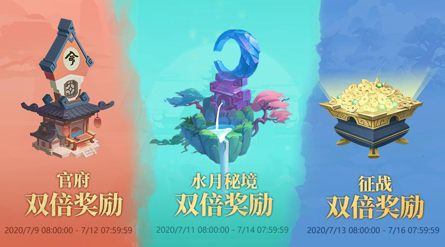 ◆双倍活动活动期间,官府奖励、水月秘境战斗奖励和征战挂机的铜钱、经验丹双倍产出,道具、装备双倍掉落。
