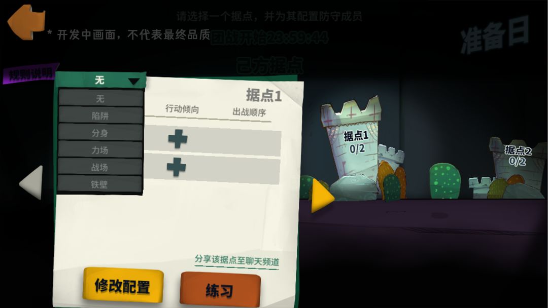 大家可以在准备日培养、调整、打磨防守流派、排布防守与选择角色个性。团长与副团长可以协助调整防守人员并设置据点特性,为即将到来的开战日,做好充足的准备。