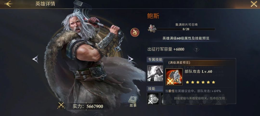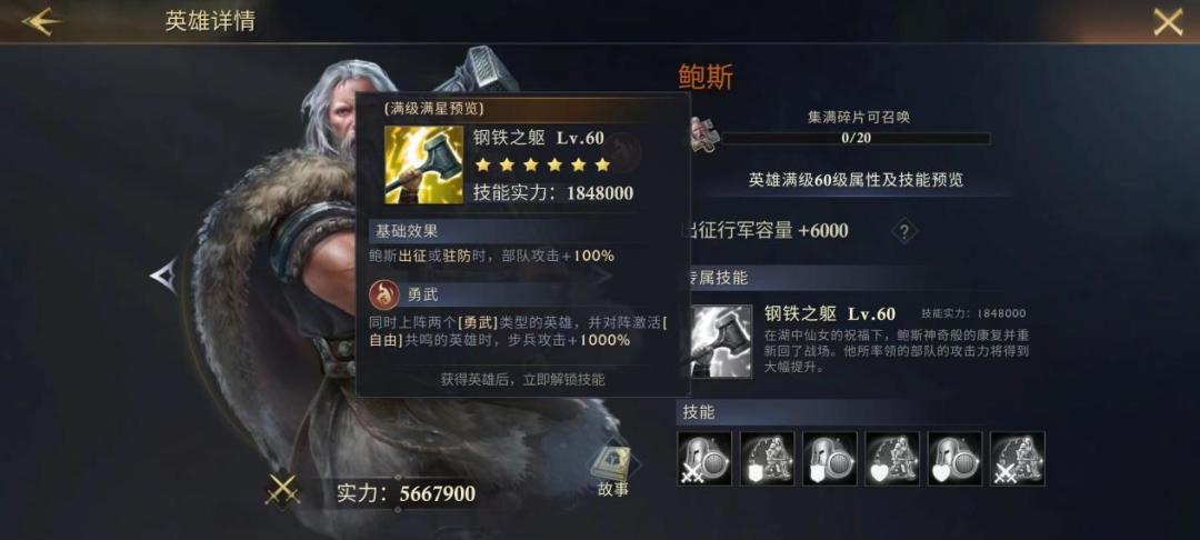 开荒期最强组合,鲍斯激活勇武词条后【钢铁之躯】让步兵攻击+1000%,部队攻击+100%,高额的加成再配合戈洛伊斯的【不义之灾】附加伤害后简直不要太恐怖,就算遇到同类型的兵种基本都是碾压,更别说有兵种克制这项条件的存在。