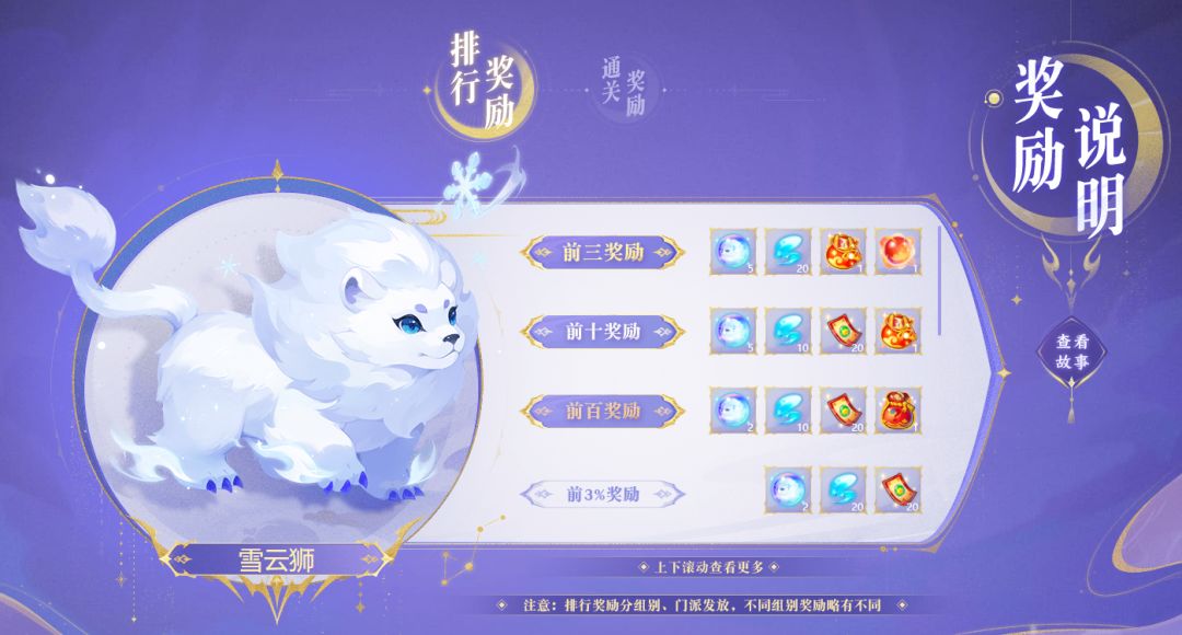 为了能让更多玩家体验到九转天阶玩法的乐趣,《梦幻西游》手游还对本赛季的奖励进行了优化和提升,在勇者及勇者之前的段位中增加了星石粉尘、阵法宝箱等3星完成道具奖励。而成功跻身三大组别门派排行榜的玩家,也将有更大机会获得雪云狮灵珠、超级幻色丹、高级魔兽要诀、召唤灵积分券、星石精魄等丰厚好礼!