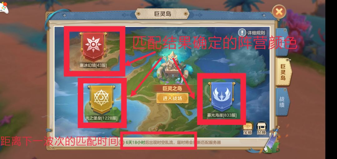 简单来说,这个巨灵岛就相当于匹配的三个服务器玩家进行三方对战。对同服务器玩家都是和平模式,对其他两个服务器玩家都是攻击模式。