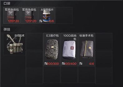 我推荐大家使用:AP镇痛片*1+标准军用手术包*1+标准军用急救包*2+100D战地医疗包*1。这样一套组合,非常经济实惠。AP镇痛片价格低,耐久高,还不占用过多格子。军用手术包价格非常美丽,他的缺点也可忽略不计。有人可能会疑惑:为啥带了军用急救包,还要带战地医疗包呢?这是因为军用急救包启用速度非常快,激烈战斗时可以快速恢复状态。而100D医疗包耐久高,可以在战斗结束用来恢复健康值。并且,不用携带绷带,又省下了宝贵的格子。