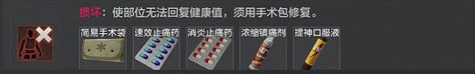 下图中的伤害救治药品从用途上可分为绷带、手术包、吸入器三种。前面说的创口也就是流血状态,就可以使用绷带治疗。手术包可以用来治疗损坏状态。当玩家使用手术包时,玩家不可移动。并且,只有使用STO战地手术套装才能恢复部位的正常状态。其他手术包,用完之后就会扣除部位健康值上限,特别是简易手术袋,简直是截肢。对了,使用手术包时,千万记得找一个安全的地方,因为使用用手术包时不可移动!