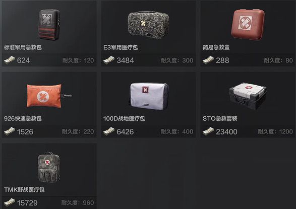 医疗包如下图所示,共计七种。使用医疗包,即可回复玩家的健康值。不过,不同的医疗包回复健康值的速率、启用速度、消耗水量不同。最后的STO急救包、TMK野战医疗包不仅能回复健康值,也可以治疗创口状态。