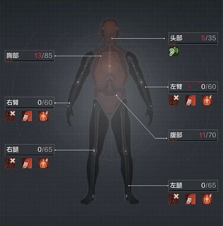俗话说:对症下药,在暗区中也自然如此。游戏内健康系统分为损坏、创口、疼痛三种主要伤害,还有肺损伤、饥饿、饥渴等次要负面效果。当玩家身体部位健康值消耗殆尽,则会极大的削弱部位能力,即为损坏。比如,左胳臂损坏则会大幅度降低压弹速度。
