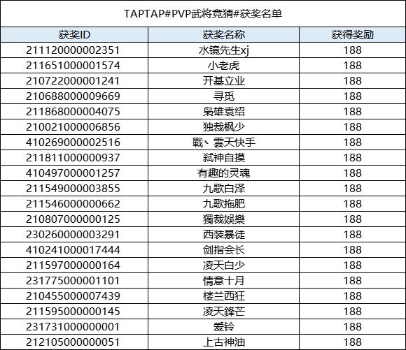 恭喜以下主公本次活动奖励,奖励会在7个工作日内发布到对应ID邮箱内,请注意查收