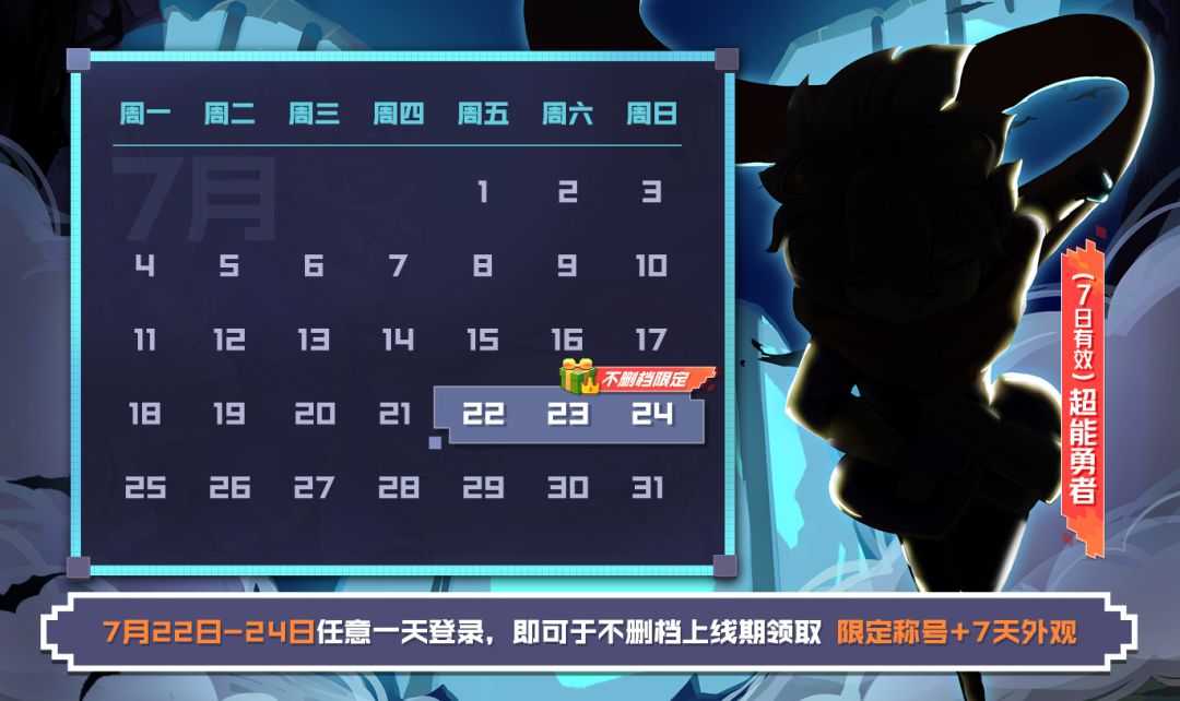 7月22日(周五)—7月24日(周日)登录:专属称号,(7日有效)超能勇者外观