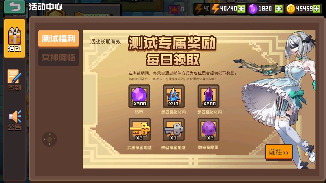 2.测试期间到达40级:奖励装备钥匙*5,武器钥匙*5