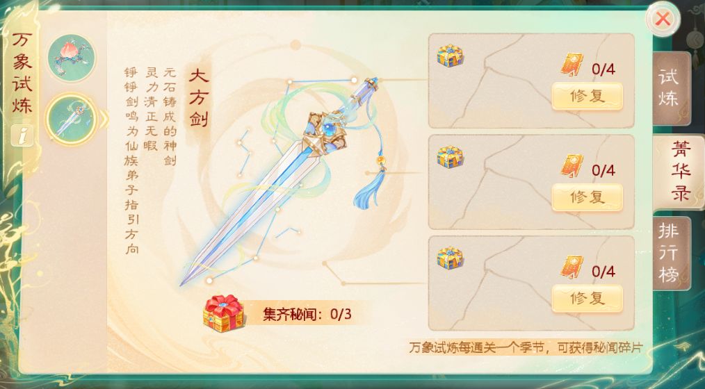 玩法二:菁华录剧情秘闻系统-菁华录开放!通过万象幻境的历练可获得菁华录碎片,了解师门法器的秘辛与旧闻,解锁秘闻还可获得额外奖励!