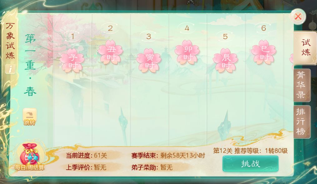 玩法一:万象秘境参与条件:等级>=80级少侠通过引导任务后,可在门派师傅NPC处开启玩法,也可通过活动日程-其他进入“万象试炼;试炼共分三大层级,一个系列轮回总计48层一级(X重):一重、二重、三重、四重二级(四时):春、夏、秋、冬三级(十二辰):子、丑、寅、卯、辰、巳、午、未、申、酉、戌、亥