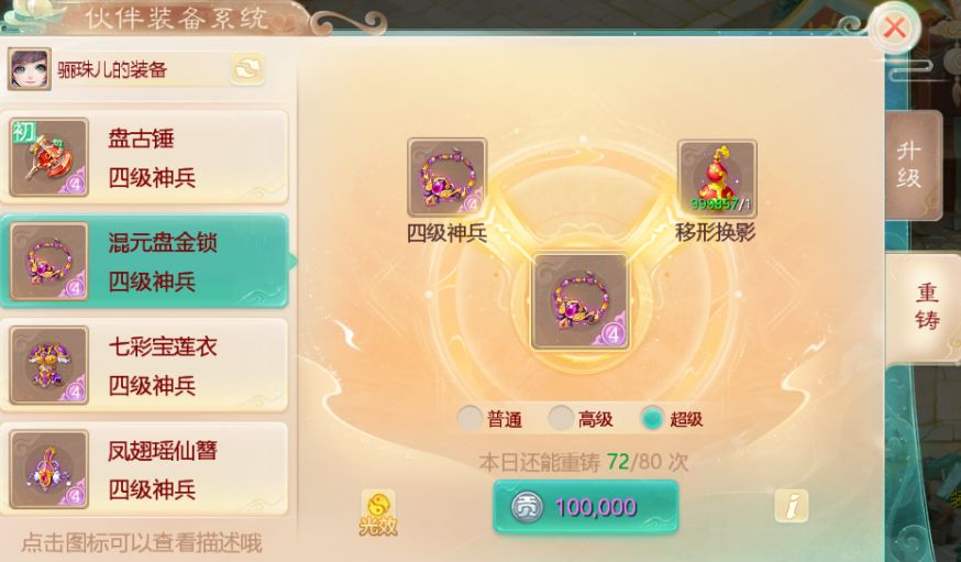 玩法三:伙伴装备玩法介绍伙伴等级达到60级,将开启伙伴装备系统,包含:武器、衣服、项链、帽子、鞋子;装备系统开启后各项装备默认为空,可以消耗伙伴修炼册与师贡获得装备;伙伴装备不可拆卸替换,每件装备有若干属性词条,词条类型根据伙伴固定,词条值有浮动;少侠可对装备进行重铸或升级;装备重铸装备重铸操作可重新随机一件装备的词条百分比,数值浮动,词条类型不变;重铸分为普通、高级、超级三种级别,效果分别为重铸1次、5次、20次;重铸消耗一定量的师贡和移形换影,不同级别的 装备重铸消耗量不同;重铸后玩家可在重铸结果中选择一个来保存替换当前装备的属性;每件装备具有1条隐藏属性,默认为未开启状态。隐藏属性的数值类型和伙伴绑定,属性条目分初级、中级、高级3个等级,每个等级对应一个固定数值;