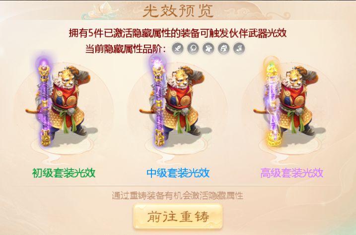 当一个伙伴拥有5件已经激活隐藏属性的装备时,伙伴的武器会发光,光效等级与隐藏属性等级相关;