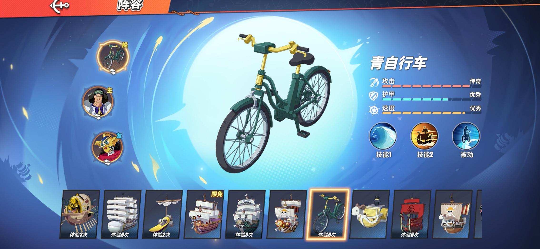 最后来看一下航线目前唯一带有特效的海上交通工具☞青雉自行车,也是在夺宝奇兵里唯一需要近战的船,数据面板比较一般。而且与艾斯船一样人物只能选用规定的,比较限制。