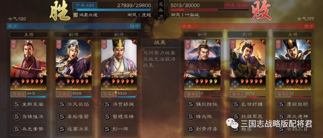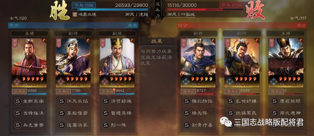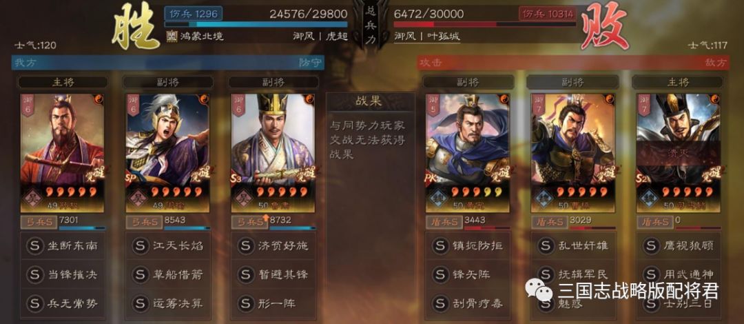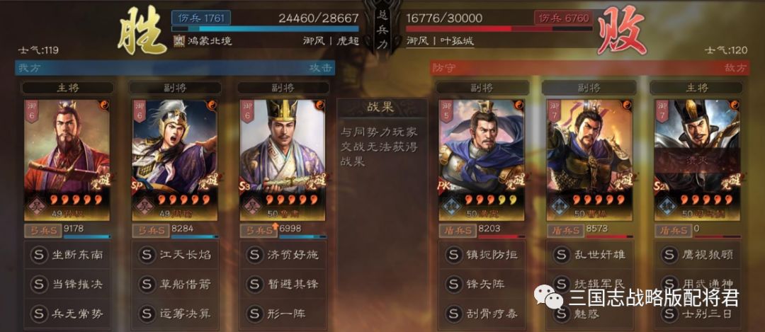 总结:基本上这套阵容打太尉盾的胜率可以达到八成左右,剩下2成可能平局或者小劣势,基本不存在翻车的可能性。同时鲁肃在拥有S兵种的情况下,配合高智力带来的减伤配合援助甲,也不怎么惧怕爆头队伍!