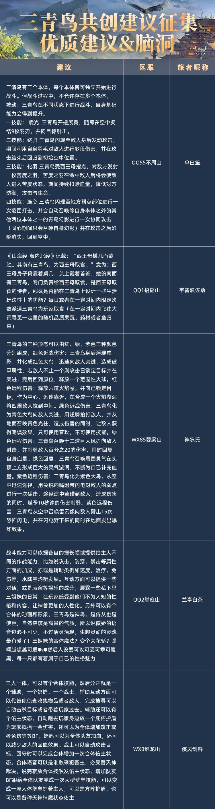 对了!在三青鸟共创建议征集中,我们收获了许多旅者优质的建议,大家的想法和脑洞让我们叹为观止!在这里少昊贴了几条,大家可以一起看下: