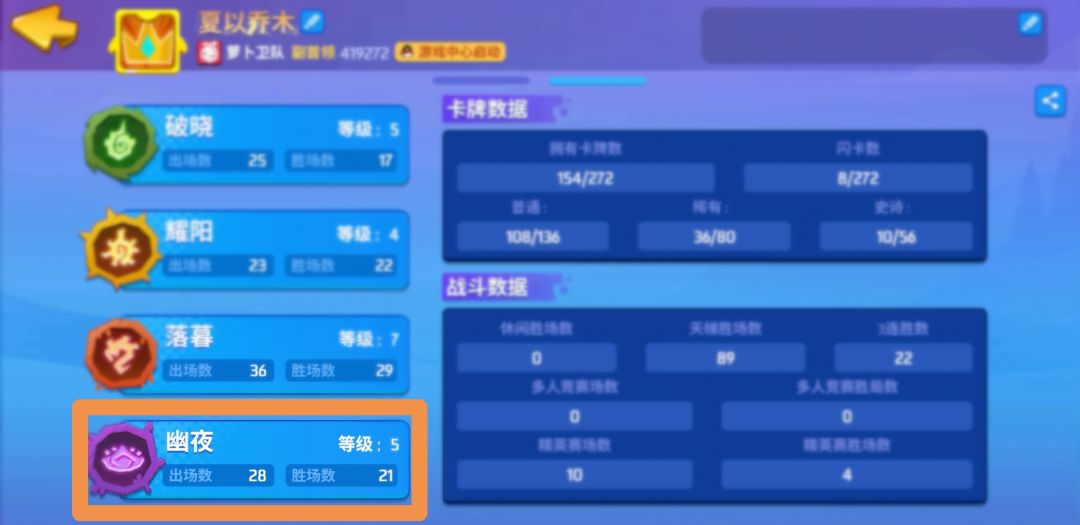 机关流幽夜之前的数据,出场 28 胜场 21 计算可得,败场 7