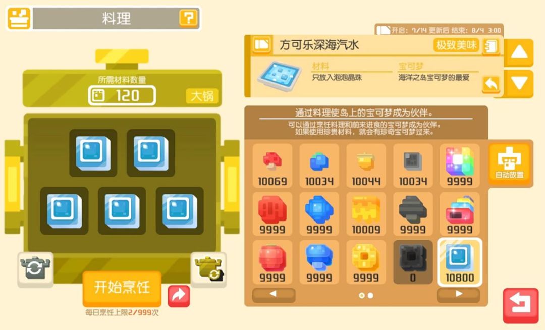 探险家们如果想要结识新的宝可梦伙伴,美味新料理方可乐深海汽水了解一下?只需将活动食材泡泡晶珠放入锅中,就能烹饪出极致美味的深海汽水,这可是海洋宝可梦的最爱!除了能够吸引到盖欧卡、龙虾小兵、珍珠贝、利牙鱼、吼吼鲸、丑丑鱼等新世代海洋宝可梦伙伴外,还有概率吸引到玛瑙水母、太阳珊瑚、大钳蟹、角金鱼、墨海马、小海狮、灯笼鱼、铁炮鱼、海星星等海洋宝可梦哦~探险家们快用美味料理吸引它们成为你的强力伙伴吧!